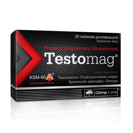 Testomag marki Olimp to preparat magnezowy dla mężczyzn uzupełniony o składniki naturalnego pochodzenia jak ekstrakt z Ashwagandhy KSM-66 oraz witaminy i minerały takie jak: cynk, selen czy witamina B6. Mężczyźni pragnący wspierać metabolizm energetyczny, homeostazę, pamięć, koncentrację i logiczne myślenie oraz prawidłowy poziom testosteronu, powinni w codziennej diecie sięgnąć po OLIMP Testomag. Czy wiesz, że jeśli starasz się o dziecko to preparat olimp, dzięki zawartości cynku, korzystnie wpływa na proces sprrmatogenezy? Czysty i prosty skład OLIMP Testomag zawiera także ekstrakt z ashwagandy, która jest roślina adaptogenną, czyli korzystnie woływa na adaptacje do czynników stresogennych. Może być to ważne dla mężczyzn prowadzących szybki i stresujący tryb życia.