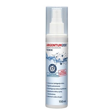 Argentum200 to tonik w postaci mgiełki o gwarantowanej wysokiej zawartości srebra koloidalnego, przeznaczony jest do każdego rodzaju cery. Tonik jest sporządzony na bazie najczystszej wody demineralizowanej. Regularne stosowanie mgiełki oczyszcza i pielęgnuje skórę eliminując problemy dermatologiczne. Srebro koloidalne działa też pomocniczo przy odkażaniu , nie powodując przy tym podrażnień. Mgiełka jest także bezpieczna dla skóry wrażliwej.
