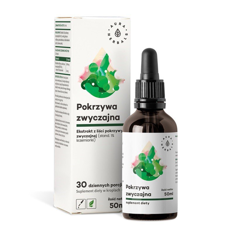 AURA GLOB Pokrzywa zwyczajna ekstrakt 10:1 1000 mg 50 ml to wysokiej jakości suplement diety, którym warto wspomóc codzienną dietę. Preparat zawiera w swoim składzie ekstrakt z liści pokrzywy zwyczajnej standaryzowanej 1% krzemionki. Pokrzywa zwyczajna od niepamiętnych czasów była wykorzystywana w medycynie naturalnej. Do najważniejszych właściwości prozdrowotnych pokrzywy zwyczajnej zaliczyć można: wsparcie układu krzepnięcia krwi, wsparcie naturalnego oczyszczenia organizmu, wsparcie leczenia ran i stanów zapalnych, wsparcie odporności, wsparcie układu stawowo-kostnego, opóźnienie starzenia czy wsparcie odporności.