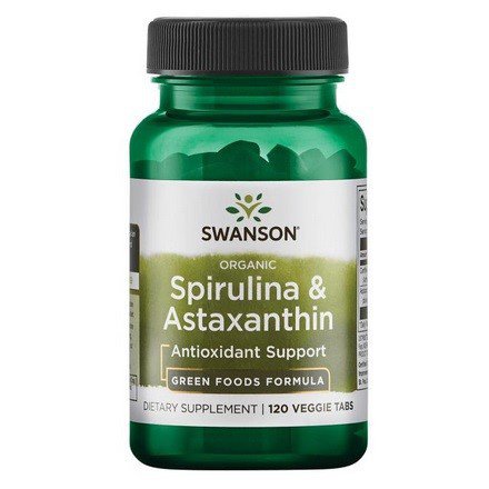 SWANSON Spirulina + Astaksantyna organiczna dostarcza składniki odżywcze i chroni organizm przed stresem oksydacyjnym.