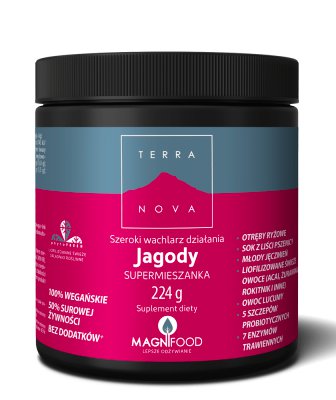 TERRANOVA Jagody SUPERMIESZANKA to nowoczesny suplement diety o bogatej, maksymalnie czystej i prostej formule. Preparat ma postać proszku, który świetnie się rozpuszcza i można go połączyć z ulubionym jogurtem, mlekiem kokosowym czy wodą mineralną. W składzie preparatu znaleźć można, mieszankę owoców takich jak: jeżyny, czarna malina, aronia, żurawina, acai, rokitnik, borówki, czarny bez, truskawki. Ten wachlarz owoców składa się na mieszankę liofilizowanych jagód, która powstaje w Technologii phytoFresh, w momencie kiedy zostają zamrożone świeże rośliny, a następnie są one poddane zamrożeniu i procesowi liofilizacji. Otrzymuje się dzięki temu skoncentrowaną wersję roślin, które zachowują aktywne składniki.
