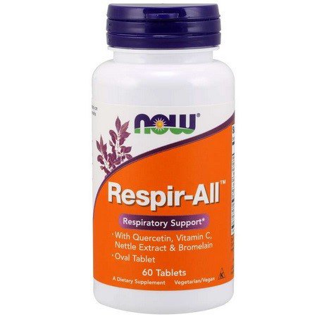 NOW Respir-All to innowacyjny suplement diety, który kompleksowo wspiera zdrowie człowieka, szczególnie korzystnie wpływając na prawidłowe funkcjonowanie układu oddechowego. Tabletka owalna Respir-All to połączenie kluczowych witamin, minerałów i ekstraktów ziołowych oraz kwercetyny i Bromelainy. Preparat ten może wspierać leczenie alergii oraz wspierać układ immunologiczny.