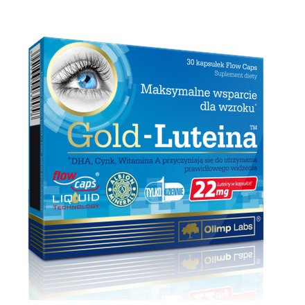 OLIMP Gold Luteina to nowoczesny dobrze przyswajalny suplement diety. Warto zwrócić na jego innowacyjną formę, a mianowicie płynne kapsułki Flow Caps, zawierające skoncentrowany olej rybi standaryzowany na zawartość kwasu dokozaheksaenowego (DHA) z grupy kwasów omega-3 oraz wysokiej jakości naturalną luteinę i zeaksantynę z aksamitki wyniosłej (Tagetes erecta L.) oraz cynk w formie innowacyjnych peletek, a także witaminy A i E. Preparat wytwarzany jest w innowacyjnej technologii Flow Casp.