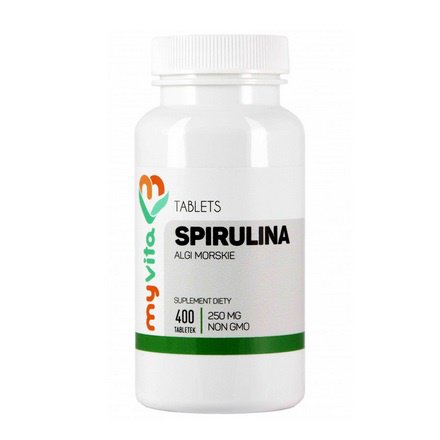 MYVITA Spirulina to suplement diety, który może wspomóc codzienną dietę człowieka. Spirulina ma bardzo bogaty skład. Jej głównym składnikiem odżywczym jest stanowiące 60-70% białko. Zawiera ono wszystkie 8 niezbędnych aminokwasów egzogennych czyli takie, których organizm człowieka sam nie syntetyzuje. To czyni spirulinę świetnym źródłem białka. Pozytywny efekt działania spiruliny jest wzmocniony przez obecność istotnych witamin i minerałów. Witaminy: A, B1, B2, B6 oraz minerałów: żelaza i wapnia.