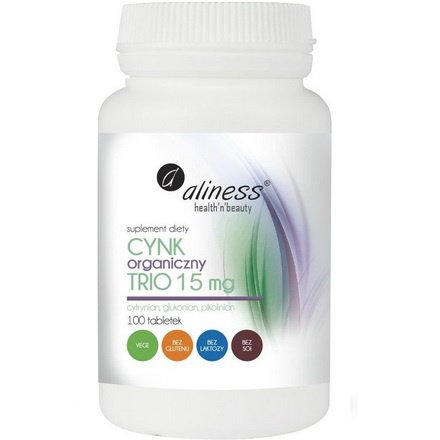 Cynk organiczny TRIO 15mg firmy Aliness jest innowacyjnym, dobrze przyswajalnym suplementem diety, który w swoim składzie dla lepszej biodostępności i efektywności w organizmie łączy działanie: cytrynianu, glukonianu, pikolinianu. Warto pamiętać, że są osoby, które szczególnie powinny zwrócić uwagę na właściwą suplementację cynku. Zaliczyć do nich można: seniorów, osoby w trakcie leczenia ran i oparzeń, kobiety w ciąży i karmiące piersią, sportowców, kobiety w okresie menopauzy, chorych na osteoporozę.
