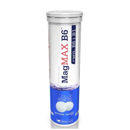 MagMAX B6 to suplement diety firmy Olimp w postaci tabletek musujących zawierający kompozycję wysokiej porcji magnezu w postaci cytrynianu, będącego dobrze przyswajalnym źródłem tego pierwiastka; oraz witamin B6 i B1. Ze względu na swoja formę, może być świetna propozycją dla osób aktywnych fizycznie i sportowców. Pomarańczowy smak jest dodatkowym atutem preparatu.