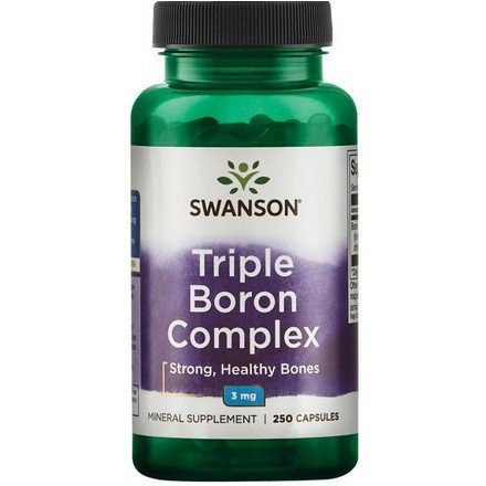 Triple Boron Complex 3mg to suplement diety firmy Swanson, Który charakteryzuje się wysokim stopniem wchłanialności i dobrem stopniem efektywności działania w organizmie człowieka. Warto wspomóc nim codzienną dietę aby nie dopuścić do niekorzystnych objawów niedoborów boru. Warto pamiętać o wsparciu codziennej diety produktami, które zwierają jego dużą ilość można do nich zaliczyć: gruszki, brzoskwinie, morele i winogrona, orzechy, jabłka czy fasolę. Niestety źle zbilansowana dieta czy słaba jakość warzyw i owoców może nie być wystarczająca, aby zapewnić prawidłowe stężenie tego minerału w organizmie człowieka.