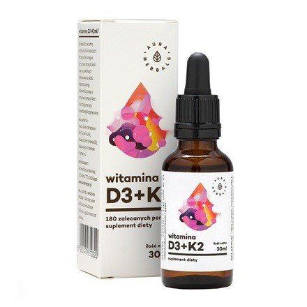 AURA HERBALS Witamina D3 (2000IU)+ K2 MK7 30ml w postaci kropel to nowoczesny suplement diety w wygodnej postaci kropel, dzięki czemu można go łatwo zastosować i uzupełnić codzienną dietę w te cenne witaminy. Ze względu na swoją nowoczesną formułę szybko się wchłania i działa od razu uzupełniając niedobory.