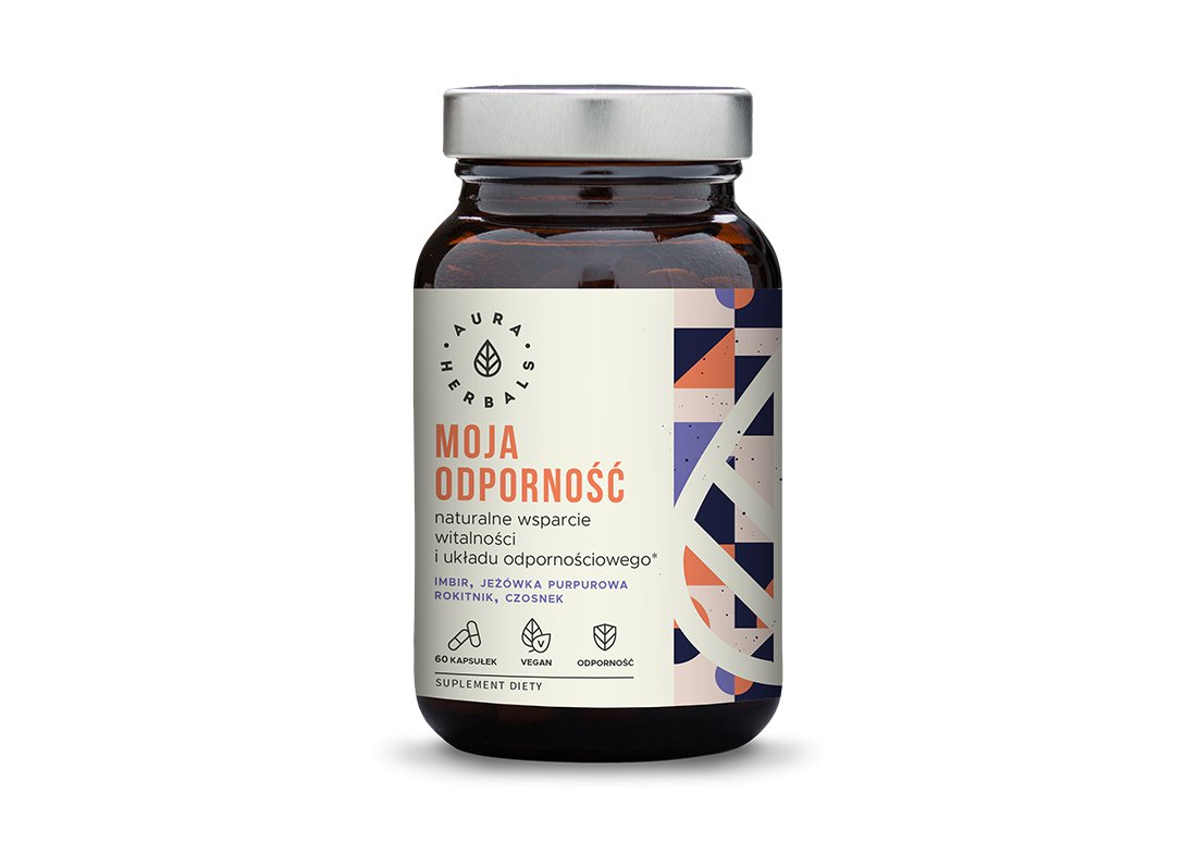 Aura Herbals Moja odporność jest suplementem diety na bazie naturalnych składników takich jak: ekstrakt z jeżówki purpurowej, ekstrakt z imbiru lekarskiego, ekstrakt z czosnku, ekstrakt z rokitnika. Eksperci uważają, że preparat ten stanowi idealny kompleks korzystnie działający na układ immunologiczny i witalność. Do najważniejszych właściwości prozdrowotnych Aura Herbals Moja odporność należy:
