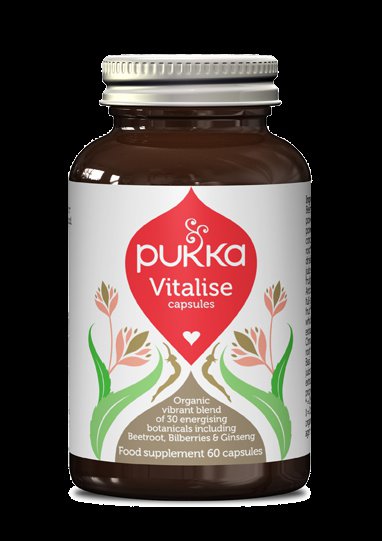 Wyprodukowany w Wielkiej Brytanii suplement diety PUKKA Vitalise Witalność ma czystą i prostą Formułę. Produkt działa efektywnie i naturalnie co jest niezwykle ważne w oparciu codziennej diety. Ekologiczna formuła suplementu diety zawiera 30 roślin, wśród których można znaleźć: amlę, reishi, borówkę, żeń- szeń oraz skoncentrowane wyciągi z ziół i przypraw, owoców, warzyw, wodorostów, grzybów, soku z trawy oraz pyłek kwiatowy. Warto zaznaczyć, że innowacyjny preparat wspiera metabolizm energetyczny na poziomie komórkowym.